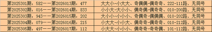 在排列三历史开奖中,第2025301期-第2025305期连续5期奖号为:582-016-943-079-497。
