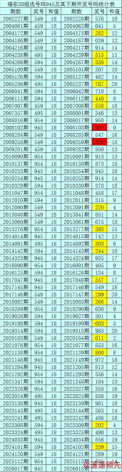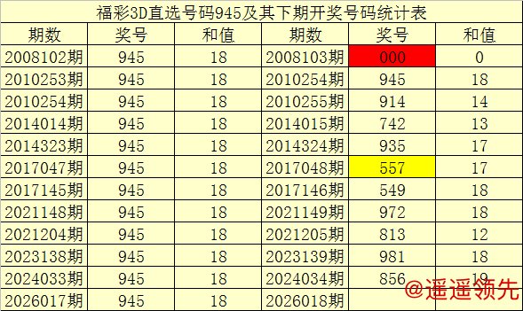 一、开奖回顾:第2026017期福彩3D奖号为945。奖号奇偶比为2:1,和值为:18,跨度为:5。