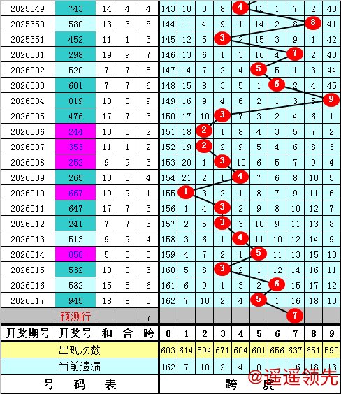 福彩3D第2026017期最大跨度开出5,跨度近期分布比较密集,主要分布在3-6区段,本期预计最大跨度在5-9区段开出,最大跨度参考6789,一码跨度参考7。